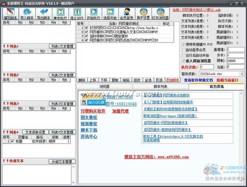全能模拟王是一款将各种常用鼠标键盘操作完美结合于一体的后台模拟操作软件,可以操作任何一个窗口程序,用户只需把各个不同的功能进行组合,就可实现各种完美的自动化操作。程序以指定窗口为操作目标,定位更准确、更快捷,并且不需要编写任何代码,一切繁琐复杂的操作都可实现自动化完成,可以说是一款全能软件可以应用到任何的领域。只有你想不到的,没有做不到的,释放你的双手,让一切都变得如此简单。